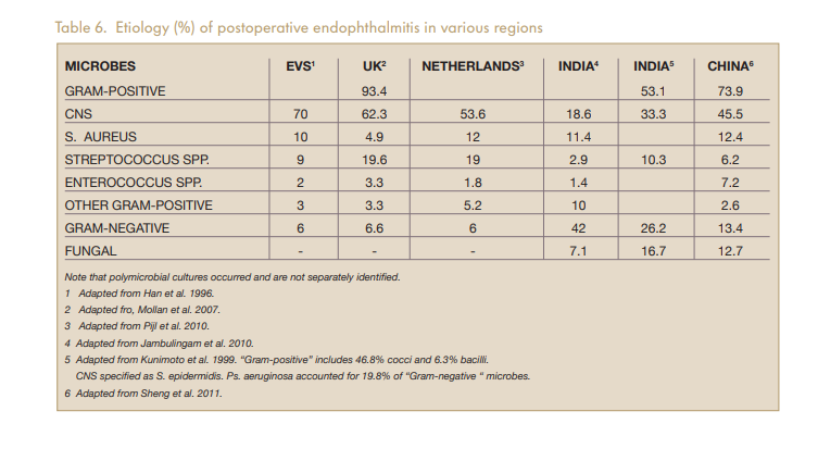 b. Eksogen : Setelah tindakan pada mata (Acute Postoperative,Chronic Postoperative,Filtering Bleb-Associated, After Intravitreal Injections), trauma open globe injury, Ulkus kornea