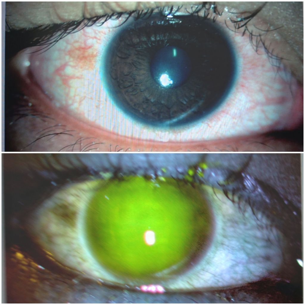 - Flouresence test positif–> perubahan warna kuning/hijau dengan sinar cobalt blue, menunjukkan adanya defek epitel kornea